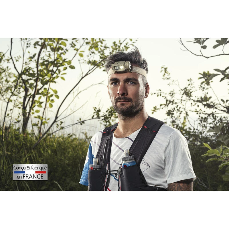 La frontale de l’armée française ! Une optique développée spécifiquement pour la marche rapide, lumière rouge pour préserver la vision nocturne. Bandeau camouflage OTAN. Chasse, Pêche, Astronomie.