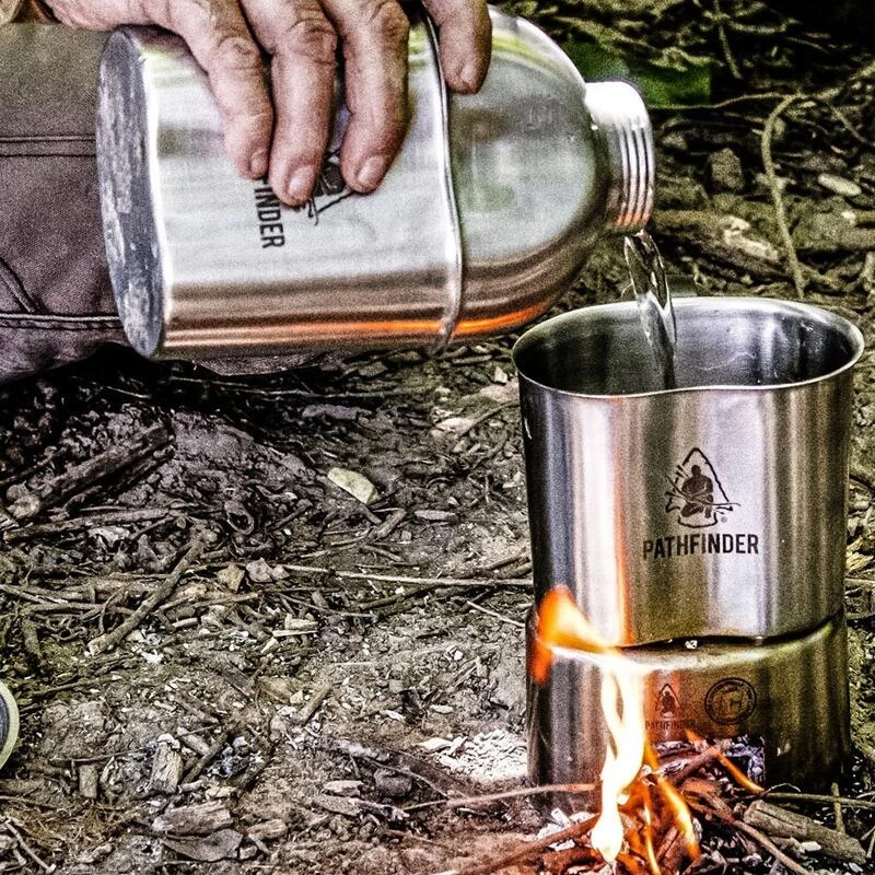 Le kit de cuisine camping Pathfinder RVS est parfait pour la cuisson en extérieur. Il comprend une flasque large à 1,15L, une casserole de 0,7L avec un couvercle et un réchaud. Toutes les pièces