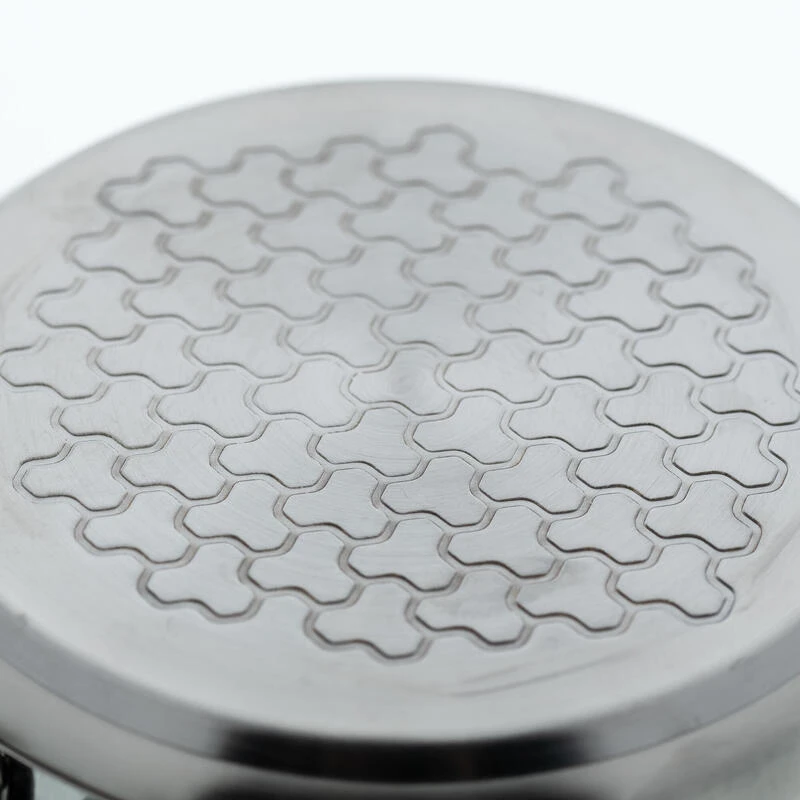 Nous avons choisi de l’acier inoxydable 18/8 (304) car il allie sécurité alimentaire et résistance à long terme. Il ne s’oxyde pas et il évite la corrosion. Il est très résistant et permet une utilisation avec tout type d’ustensiles (y compris en métal). Et comme l’inox est un peu moins conducteur que l’aluminium, nous avons intégré sous ce produit un double fond en aluminium. Cela apporte une diffusion de chaleur et une efficacité de chauffe accrue et permet de réduire la consommation de gaz.