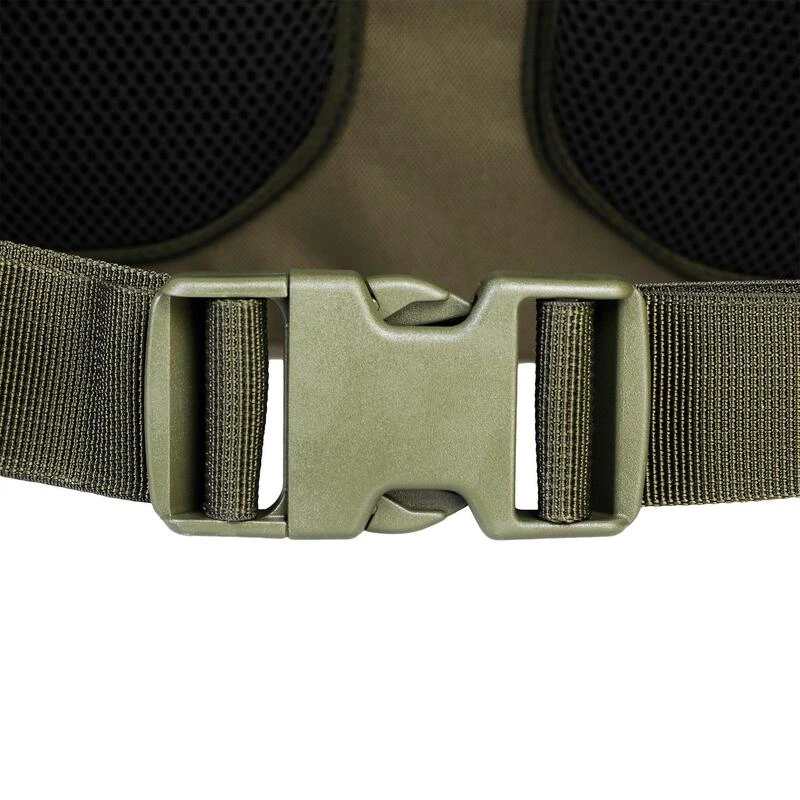 Bretelles avec mousse Polyester de 10 mm, ceinture réglable avec mousse Polyester de 15 mm et sangle de serrage poitrine. 2 sangles de compression de chaque côté du sac.